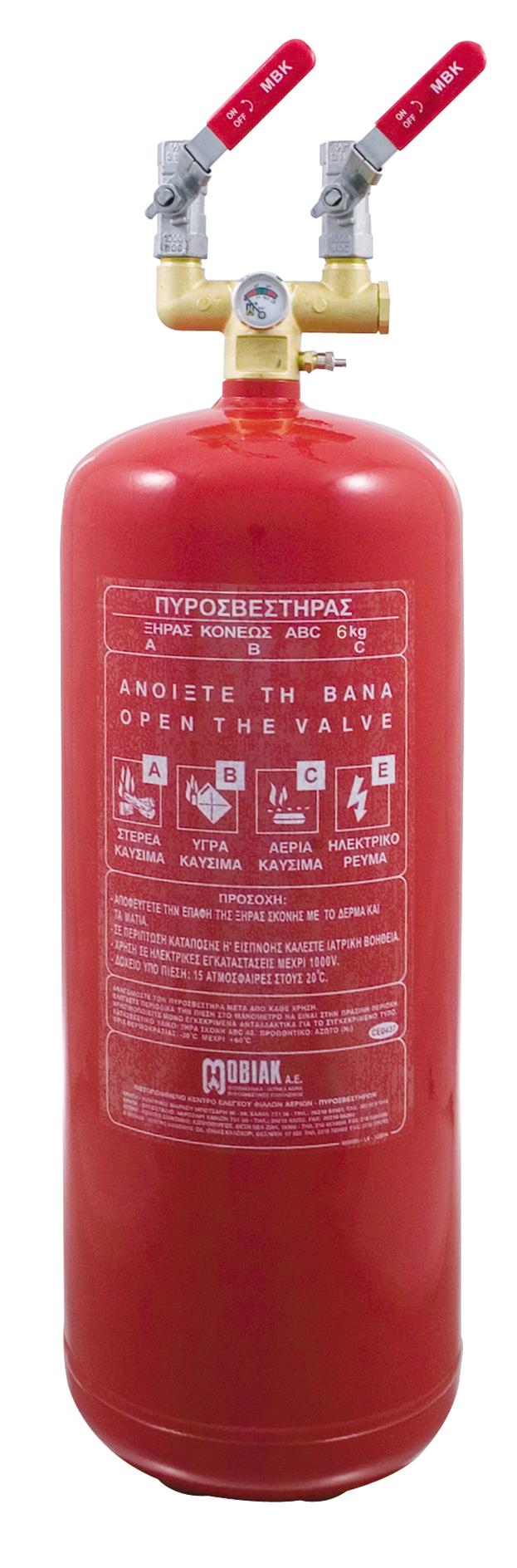 Πυροσβεστήρας Τοπικής Εφαρμογής 6Kg, Ξηράς Σκόνης ABC 40%, με Μονόραφο Δοχείο, χυτό μαστό με ασφαλιστικό, βαλβίδα πλήρωσης και Δύο ανοξείδωτες Βάνες 1/2”.