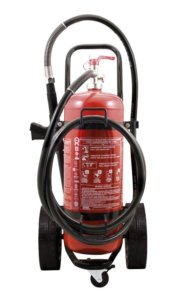 Τροχήλατος Πυροσβεστήρας, 50Kg Ξηράς Σκόνης ABC 40%, με Λάστιχο Εκτόξευσης Υλικού 5 μέτρων και με κλείστρο με Βαλβίδα Ασφαλείας Μανομέτρου.
